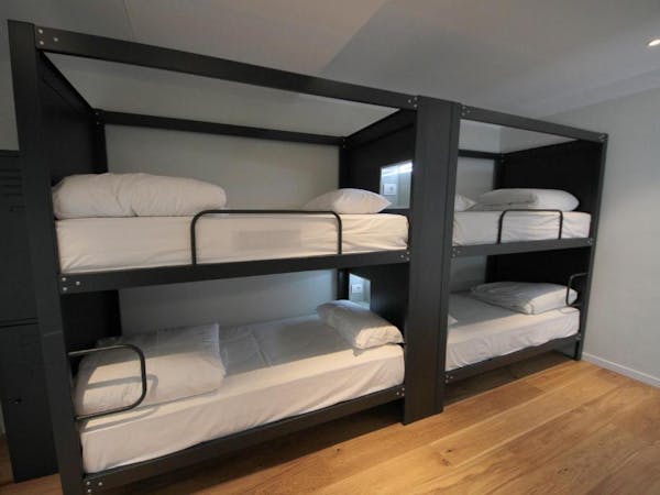 This is a private room with 6 single beds in bunk beds and a private bathroom. It does not have a TV.